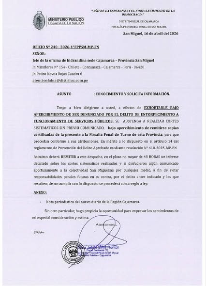 Este jueves 16, mediante el Oficio N.° 240-2026-1°FPPSM-MP-S, la Fiscalía Provincial de San Miguel, Cajamarca, liderada por la fiscal provincial Dra. Silvia Jesús Silva Ñontol, emitió una exhortación directa al jefe de la oficina de Hidrandina en la jurisdicción.