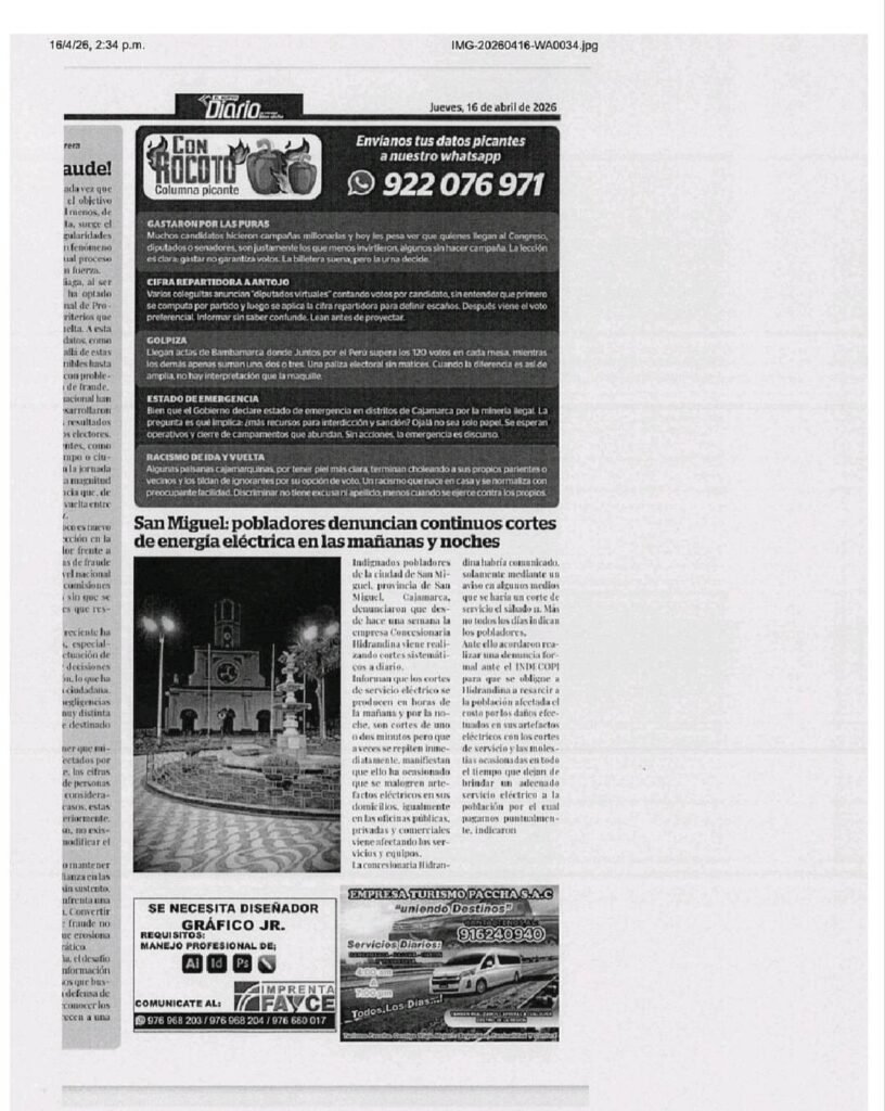 La preocupación de la población finalmente encontró respuesta. Frente a los reiterados cortes de energía eléctrica que vienen afectando a la provincia de San Miguel y sus distritos, el Ministerio Público ha decidido tomar acciones firmes en defensa de la ciudadanía.
